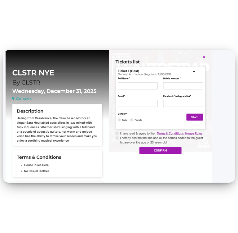 Create and manage ticket types — VIP, Early Bird, General Admission, Invite-Only — with unique pricing, availability, and schedules.